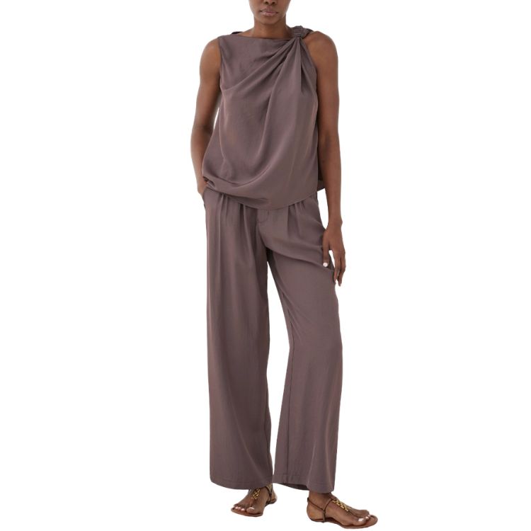 Deze palazzo broek van ELEH Prato, Italië straalt moeiteloze elegantie uit dankzij het vloeiende silhouet en de zachte glans van de stof. De warme mauve tint geeft een verfijnde, vrouwelijke uitstraling die perfect aansluit bij een moderne garderobe.