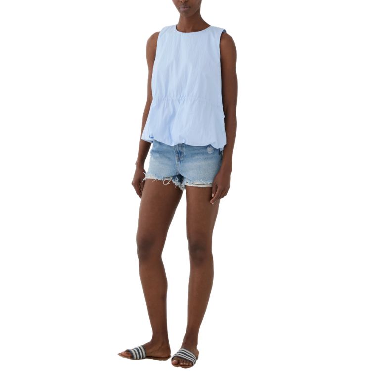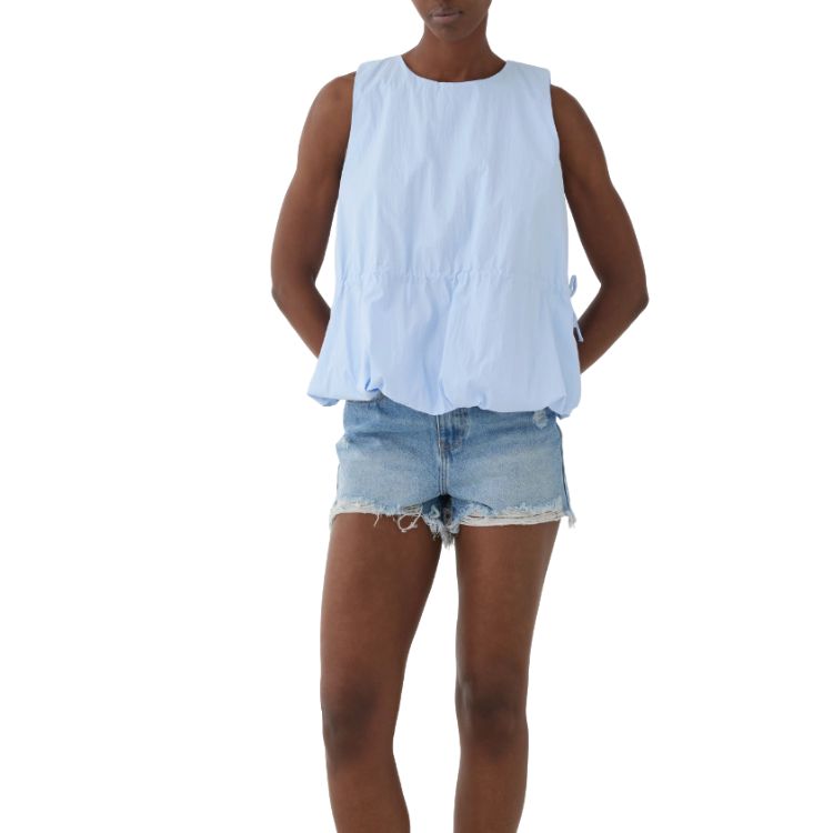 Deze verfijnde top van ELEH Prato, Italië combineert een minimalistische uitstraling met een speels, vrouwelijk detail. De zachte hemelsblauwe kleur geeft een frisse, lichte uitstraling die perfect past binnen een zomerse quiet luxury garderobe.