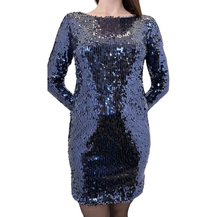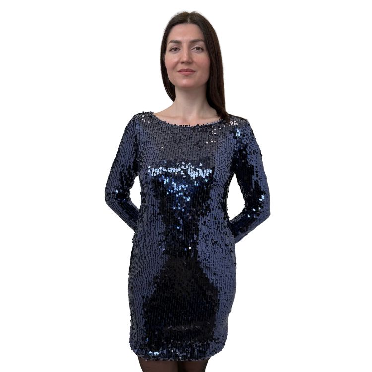 Deze verfijnde avondjurk in diep nachtblauw is ontworpen voor bijzondere momenten. De luxueuze pailletten vangen het licht op elegante wijze en geven de jurk een ingetogen glamour. Lange mouwen zorgen voor balans en klasse, terwijl de open rug een subtiel sensueel accent toevoegt. Volledig gevoerd voor optimaal draagcomfort en een perfecte pasvorm. Een exclusieve keuze voor feestelijke avonden, diners en events waar stijl en uitstraling samenkomen.