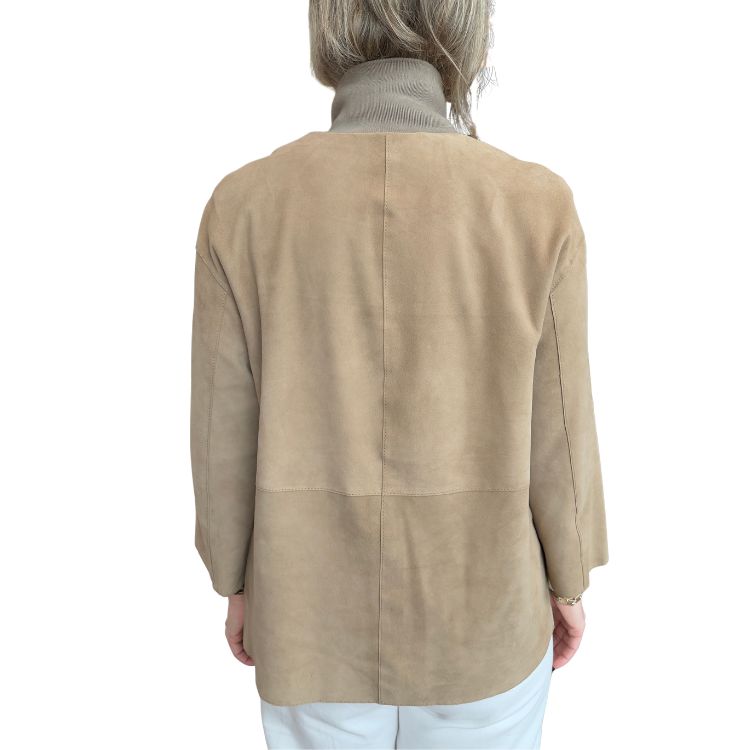 Deze elegante jas van Jackie Leathers uit Asti, Italië combineert luxe suède met een comfortabele gebreide sweaterkraag. De lichte A-lijn pasvorm zorgt voor een vrouwelijke en flatterende silhouette, terwijl de hoge kraag een moderne, sportieve touch geeft.