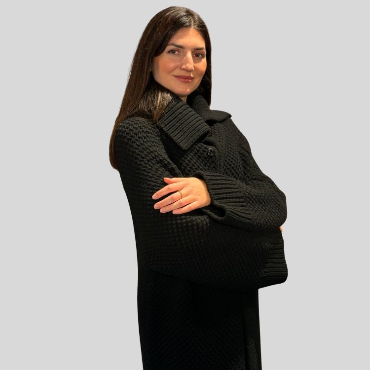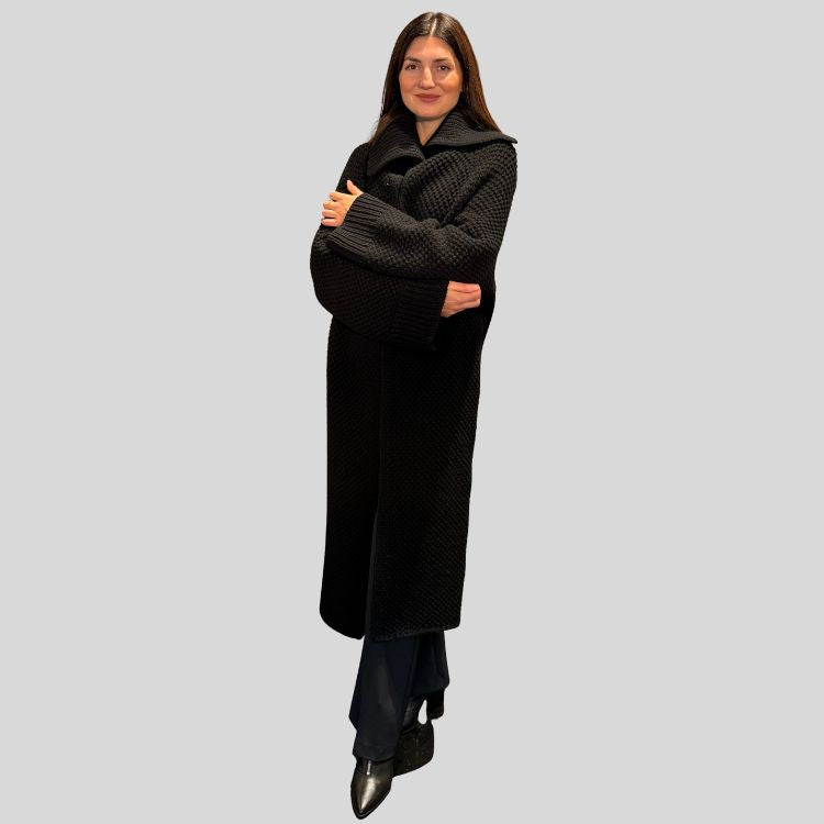 Lange vest/jas van 100% merino wool dick gebreid met grote kraag.